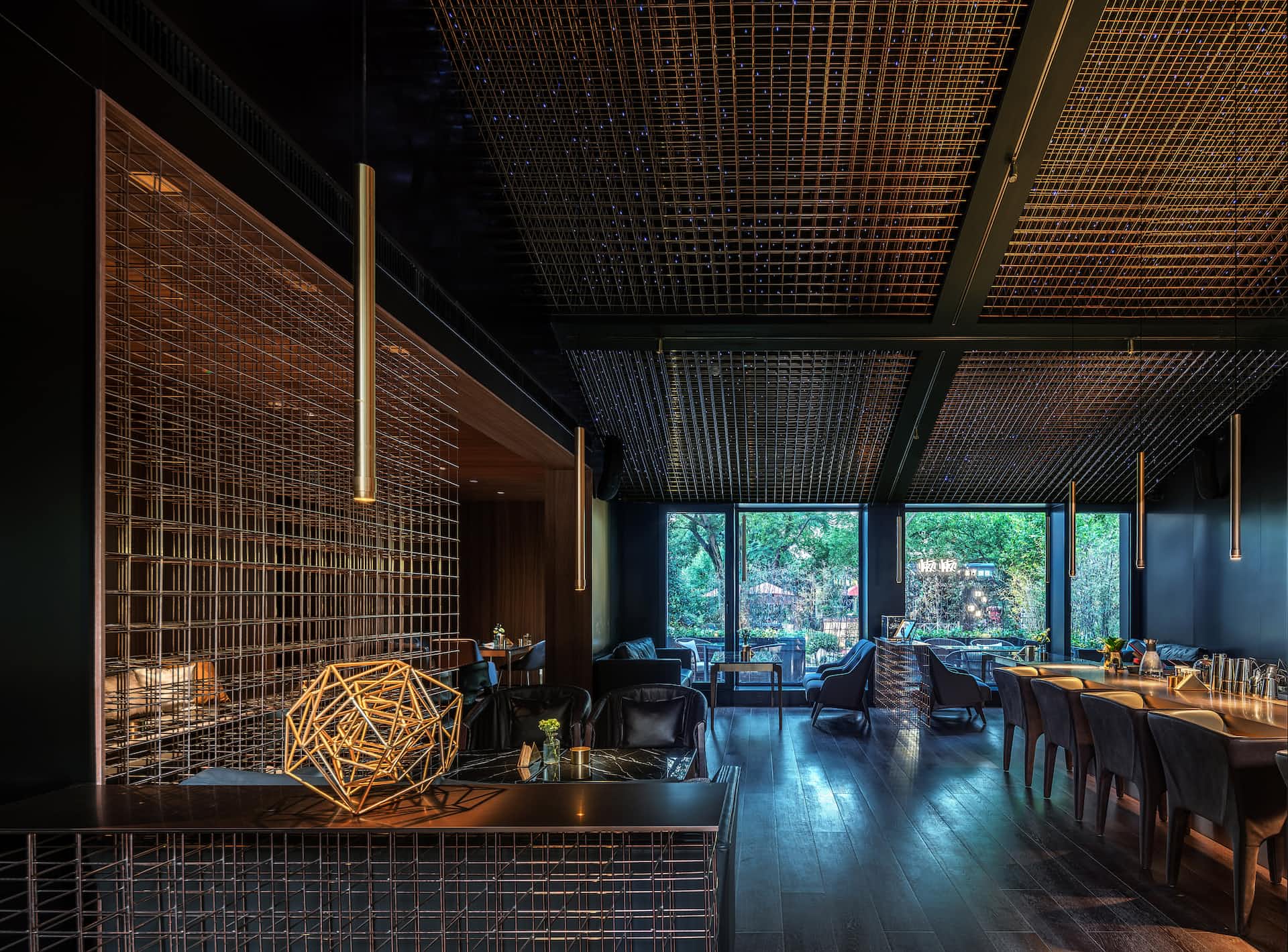 Удобное расположение ресторана, на втором этаже делает его доступным в любое время. Интересное решение с люстрами создает эффекты светодизайна в романтическом стиле.